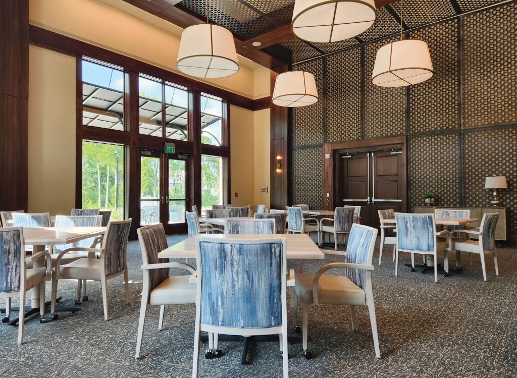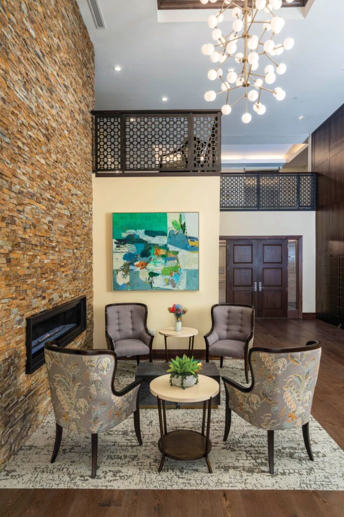 The Deerwood, which opened in November 2022, marks the entrance to our urban campus and features 42 state-of-the-art independent-living apartments with five floor plans ranging from 1,000 to 2,158 square feet. Amenities include a large community room, catering kitchen, two common outdoor terraces, a meeting room, extra storage space, garage parking under the building, and package delivery lockers in the lobby. Embodying the metropolitan feel of SouthPark, the design of The Deerwood apartments fully embraces open-concept living that fits today’s informal lifestyle. Every unit includes a private balcony or terrace as well as floor-to-ceiling windows for an abundance of natural light and maximized views. Kitchens are spacious and modern with stainless-steel appliances and quartz countertops. Meanwhile, earthy hues, clean lines and fashion-forward fabrics set the tone for the common areas on all five floors.