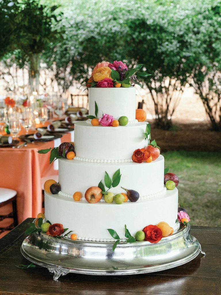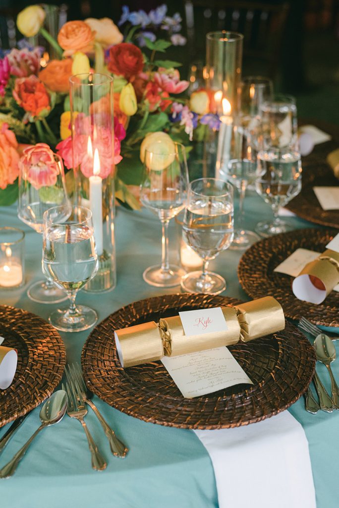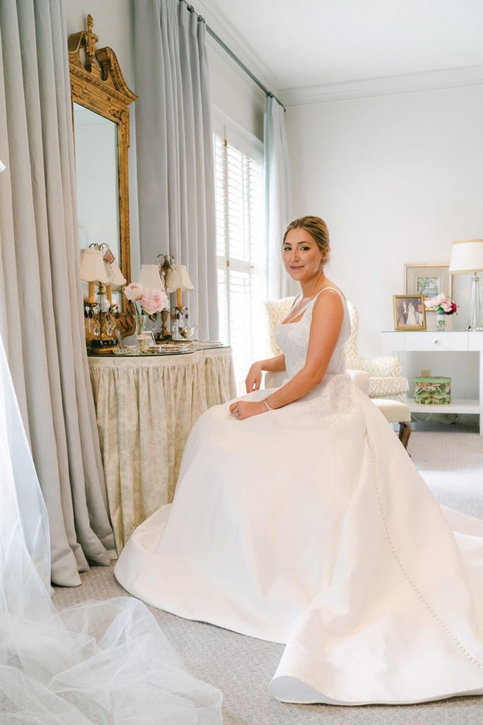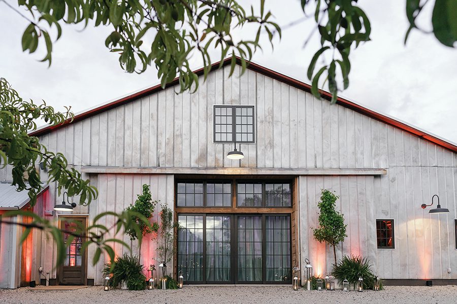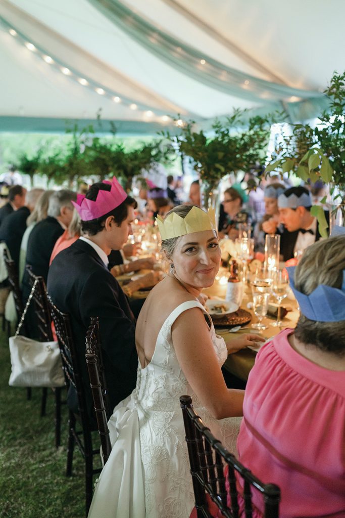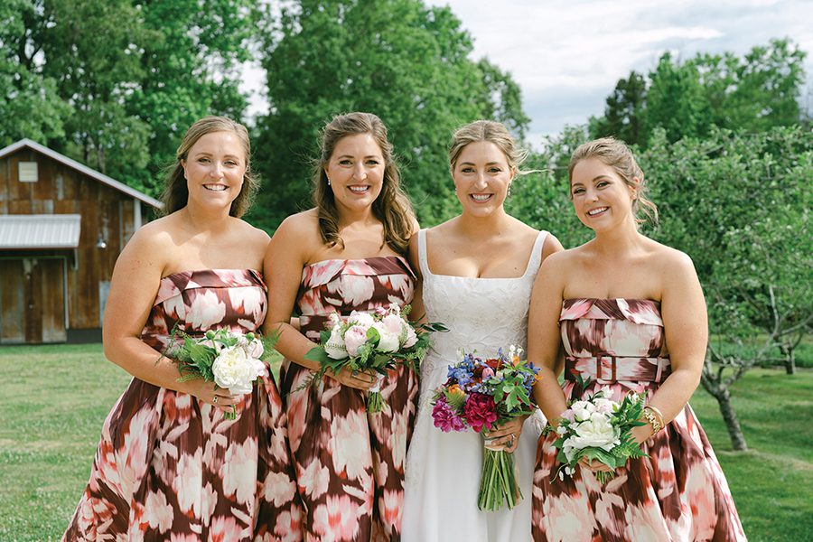 One of Elizabeth’s best bits of wedding advice is one she knows from personal experience: “Don’t harp on the nitty-gritty if something goes wrong,” she says. For her and husband-to-be Brooks’ wedding weekend, that something was the weather. During the rehearsal dinner, a tornado warning went into effect; during the outdoor wedding ceremony, rain began to fall. When it came time for the couple’s final exit, the battery in the farm’s getaway truck died. But thanks to a talented team of vendors and a willing-to-pivot mindset, those wrinkles went away, leaving plenty of time to celebrate. Ensuring their friends and family were comfortable and well-fed and the venue “felt like celebrating at home with loved ones” was important to Elizabeth and Brooks, who met at the University of Georgia. Getting married at North Corner Haven was the natural choice, as Elizabeth’s family founded the 600-acre working farm and events venue in 1972. “We wanted to bridge the gap between a formal wedding and casual atmosphere where everyone could let loose and enjoy,” Elizabeth says. Party poppers and paper crowns — something Elizabeth’s family has on hand at holidays — made the event feel familiar and fun, along with custom bandanas and family recipes served during cocktail hour (her mom’s mini tomato pies and the farm’s jalapeno cheddar sausage). “The rain was the party guest we didn’t know we needed!” Elizabeth says. “It got everyone smiling and laughing, and I think that energy carried through the whole night.”