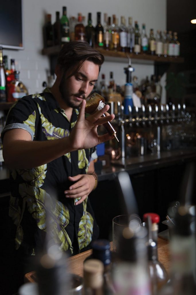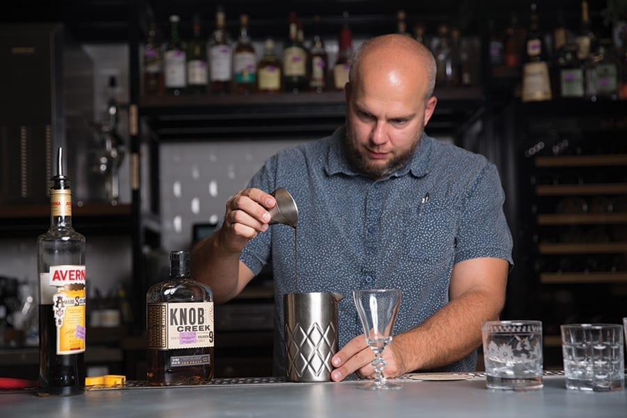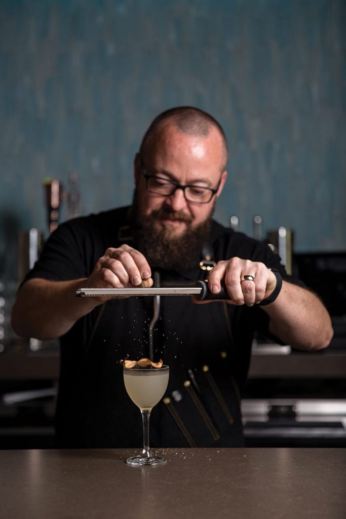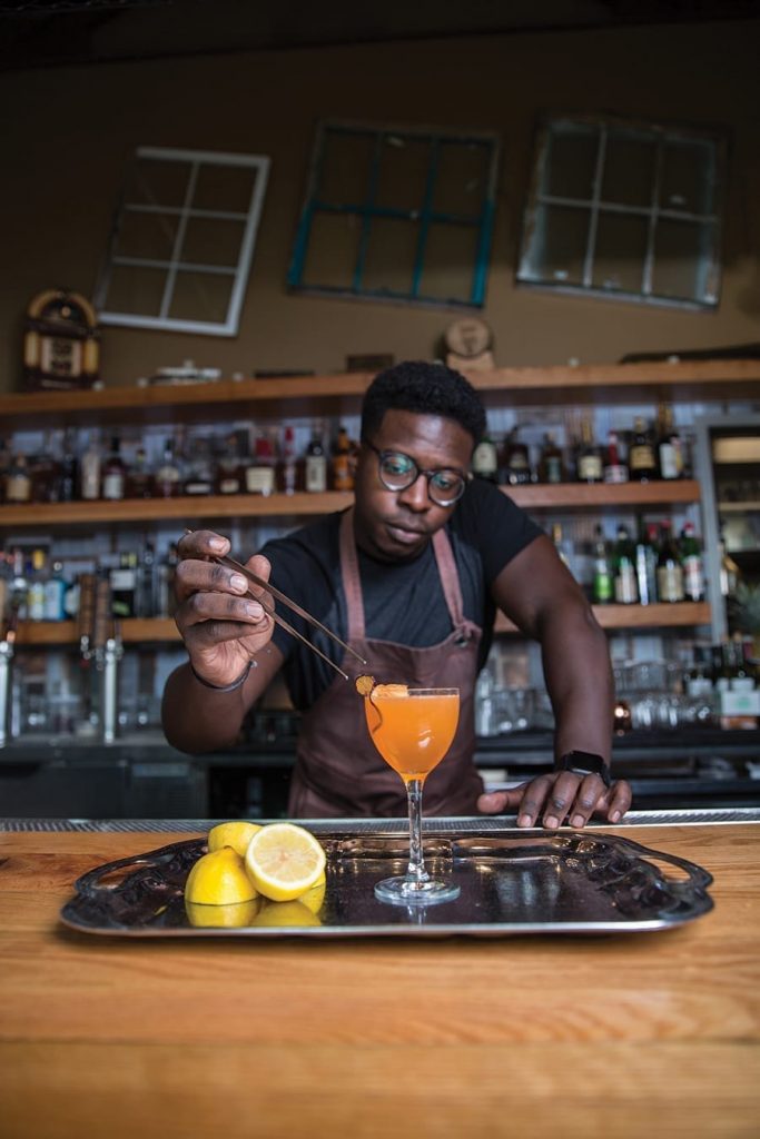 Privette took the reins as bar manager at Dogwood Southern Table & Bar this summer after several years working at Rare Roots Hospitality siblings Fin & Fino and The Porter’s House. In his Rudeneja, a Lithuanian word describing the way weather starts to feel like fall, Privette fuses autumn-inspired baking-spice flavors such as nutmeg and cinnamon in a house-made bitters. Amaro Oscura, an Asheville-based liqueur that’s made with locally foraged ingredients, is a key component. “It’s kind of what we like to do at Dogwood — using North Carolina-made and North Carolina-grown products,” says Privette, who this year was named among the top 50 U.S. bartenders by the U.S. Bartenders Guild. “The amaro just reiterates that idea behind it.” Another concept Privette has introduced: A zero-waste “farm to glass” cocktail series, featuring a weekly libation centered around a single ingredient that incorporates locally grown produce.