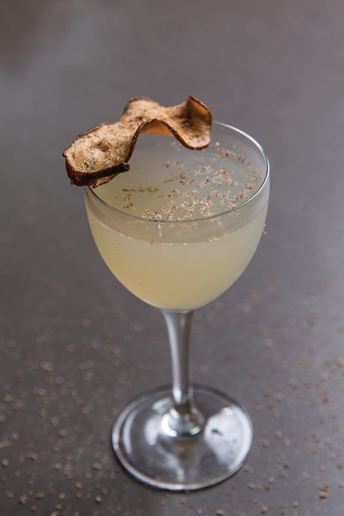 Hazelton’s cocktail combines flavors of fall with bright notes for a refreshing mixed drink. “Fall in the Carolinas is really kind of hot,” says Hazelton, whose résumé includes 5Church locations in Charlotte and Atlanta, Sophia’s Lounge, and FS Food Group. The bar manager joined Leah & Louise this spring after getting to know chef/owner Greg Collier through the Soul Food Sessions dinner series. Finally Famous is a riff on Naked and Famous, a popular cocktail created by Joaquín Simó at New York speakeasy Death & Co. Hazelton substitutes Calvados, an apple brandy, for mezcal in his variation, which is garnished with a baked apple chip.