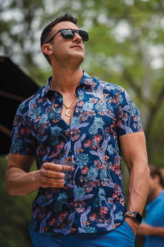 Stefan, left: Stone Rose cabana shirt, $145, and shorts, $98, King Ice Jesus necklace, $125, all from Bruce Julian