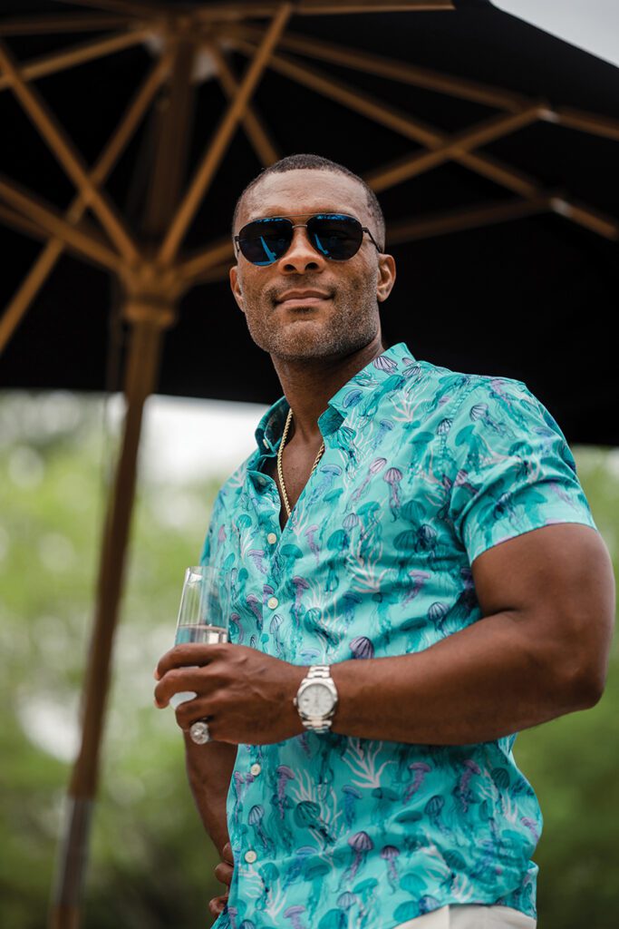 Lamar, center: Stone Rose cabana shirt, $145, and shorts, $98, Bailey straw hat, $90, King Ice Money Stash necklace, $125, all from Bruce Julian