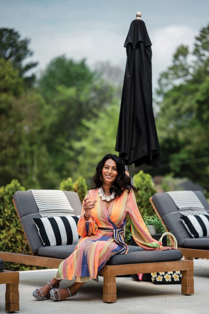 Avani: Place Nationale maxi skirt, $295, Five One Five; Twine & Twig collar, $275; Smith & Co. earrings, $68, Monkee’s of Charlotte; Krewe sunglasses, $286, Sloan; swimsuit top and shoes, model’s own