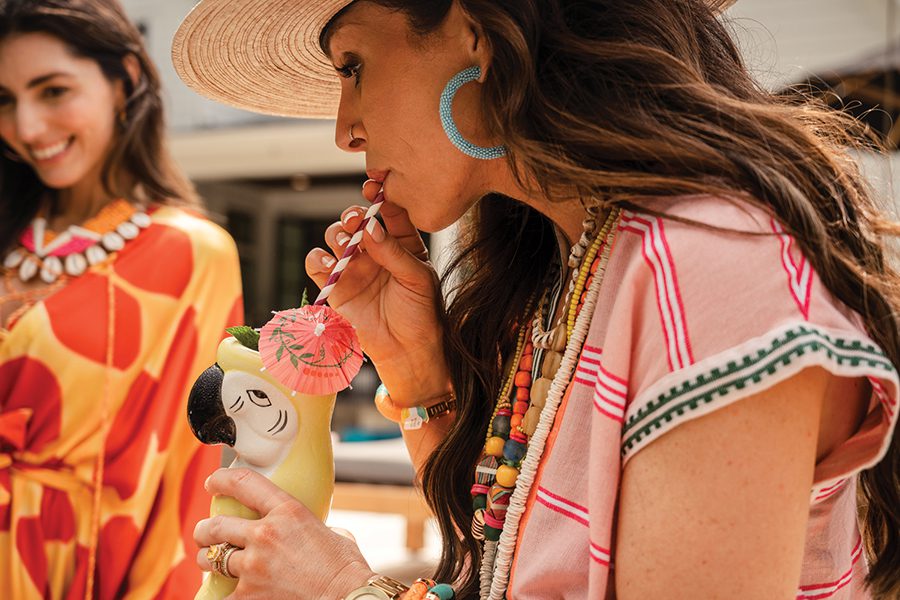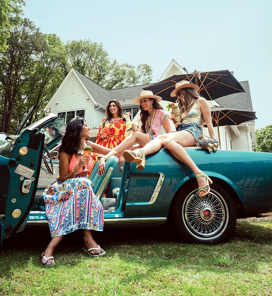 Avani: Renata Gasparian wrap, $178; swimsuit, model’s own; Melissa: Renata Gasparian wrap, $178; Twine & Twig necklace, $200; St. Armands earrings, $42, Sloan; swimsuit, model’s own; Renata: Emerson Fry caftan, $168, Cristina V trade beads, $249, and Sunshine Tienda earrings, $48, all from Monkee’s of Charlotte; all others: models’ own