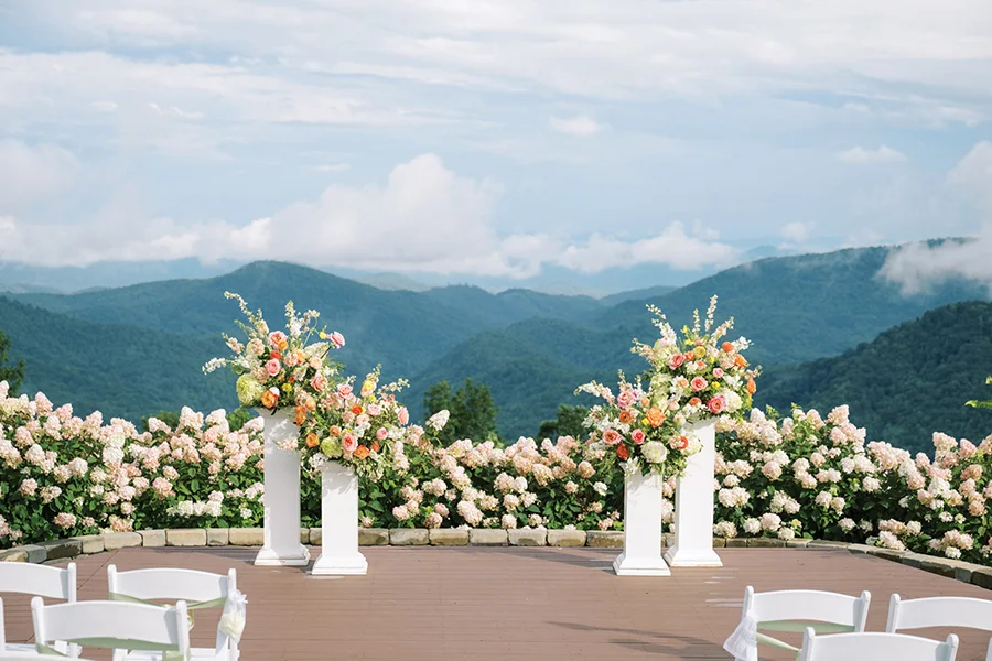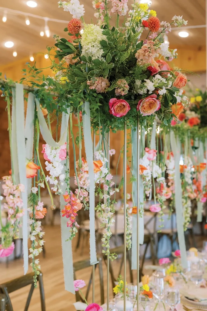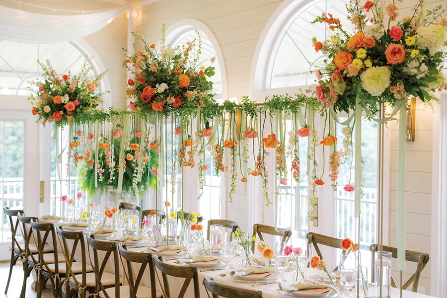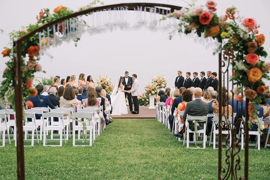 Drew’s dad served as officiant for the mountainside ceremony. Thirty minutes before, the skies turned dark and stormy, but blue skies prevailed. At the reception, specialty cocktails included Isabelle’s Passion Fizz — modeled after one of the couple’s favorite drinks from Charlotte restaurant Yunta — and Drew’s Transfusion, a frequent libation on beach vacations. A seating chart featured acrylic flowers hung from an arbor. Instead of a traditional cake, guests savored a selection of blueberry crumble cheesecake trifle, creme brulee and dark chocolate espresso pots de crème.