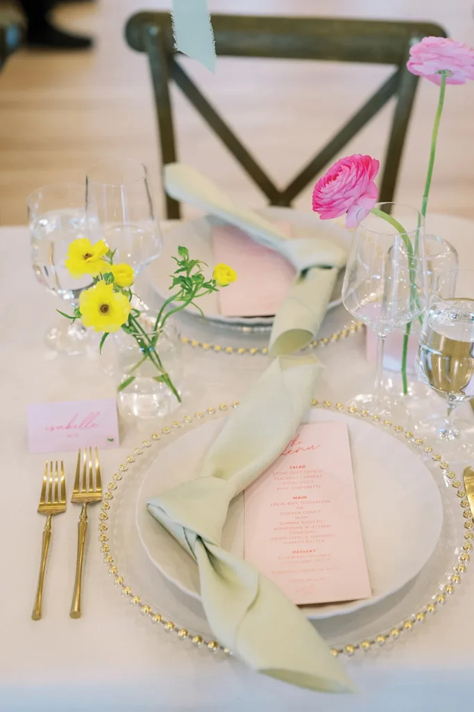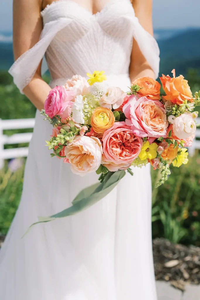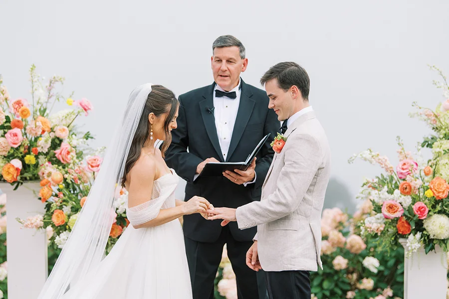 Isabelle and her mom Tori, an interior designer, took charge of the planning for the modern, romantic celebration filled with pops of peach, pink and coral and sunny mountain florals. Isabelle’s dress, with its long train and flowy vibe, felt just right. “It was perfect for the mountains and had tiny little Swiss dots and netted fabric that I knew my textile-engineer husband would love and find unique. I loved how different it was and felt so much like me.”