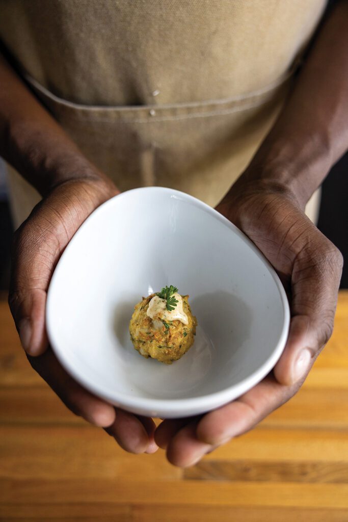 “I want guests to experience the flavor and love that goes into my food,” Williams says. It’s the kind of love — and deliciousness — that lingers long after the first bite. It’s the best flavors of his childhood: a little crab and a little shrimp, breaded together with panko, Old Bay and bits of magic, that make the “Shrab” cake recipe he shares today.