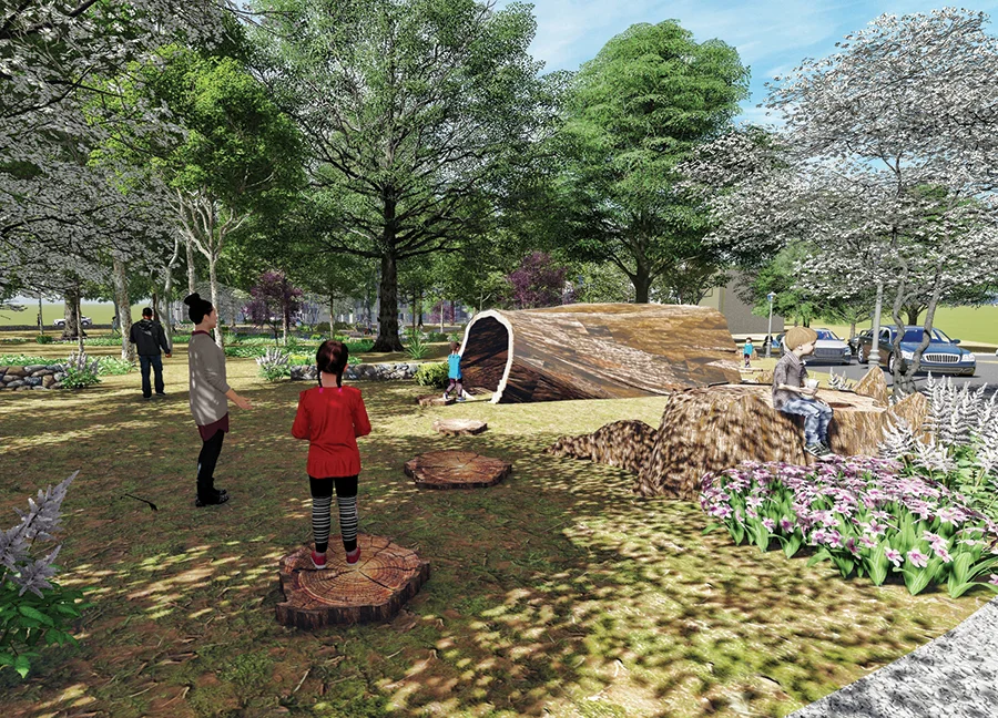Plans call for a wooden overlook deck and a low stone wall with 18 to 24 inches of stacked stone to mark the boundary of the 184 gravesites that have been identified. The plan recommends incorporating some of the natural items already available into a play area, such as tree-slice stepping stones or using a reclaimed hollow tree stump as a play tunnel. Artist Monique Luck, working with Tooley, has proposed the installation of reflecting spheres, which she describes as polished stainless steel, freestanding sculptures that act like floating balls quietly reflecting the space.