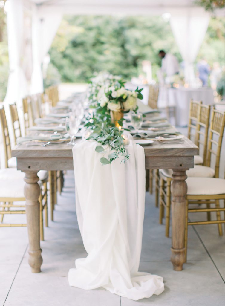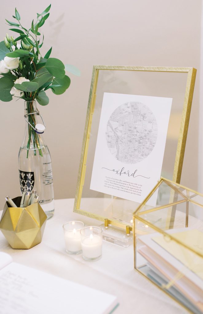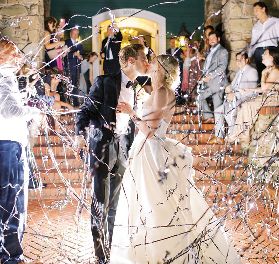 Bright, airy, romantic, classic: These are a few of the vision words behind Joey and Lauren’s dream wedding and reception. They met while studying abroad through the University of Oxford-Clemson program. Small details of their time in England were woven into their wedding day, including a thoughtfully decorated welcome table featuring a bottle from Magdalen College and reception tables named after their favorite destinations in Oxford. Lauren says the highlight of planning their big day was tasting cakes from Suarez Bakery. “I love that we were able to pick our two favorite flavors (chocolate raspberry and strawberry chiffon) and alternate layers,” she says. “Absolutely amazing cake.”
