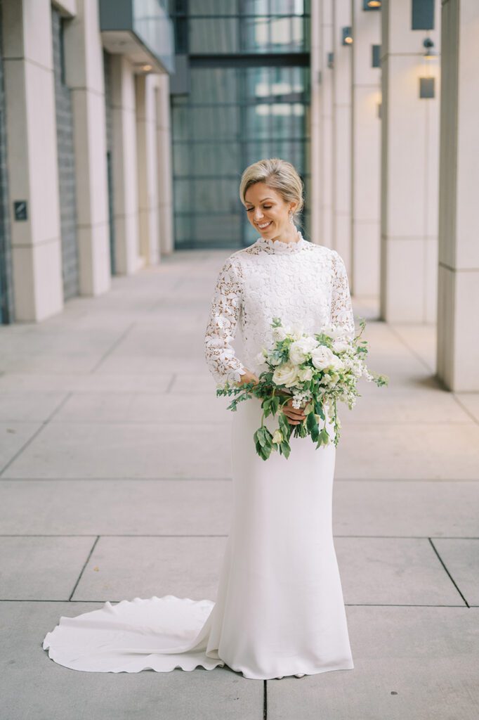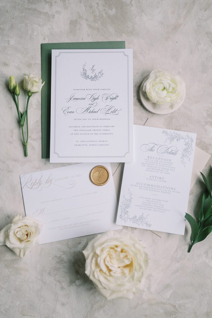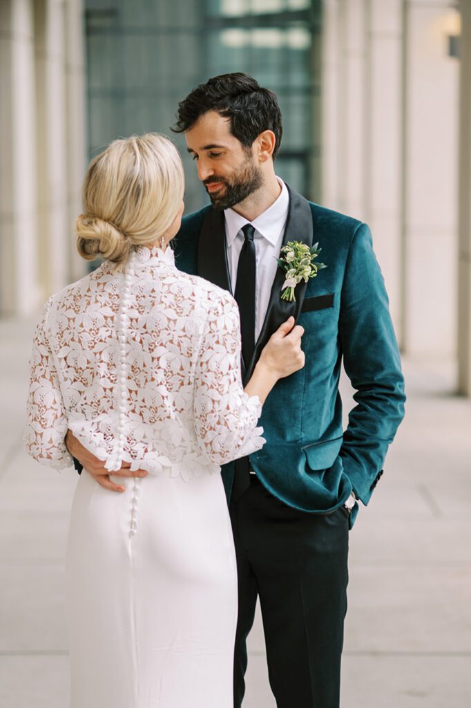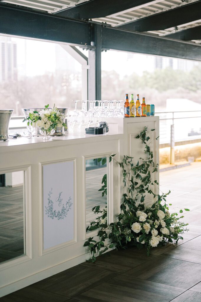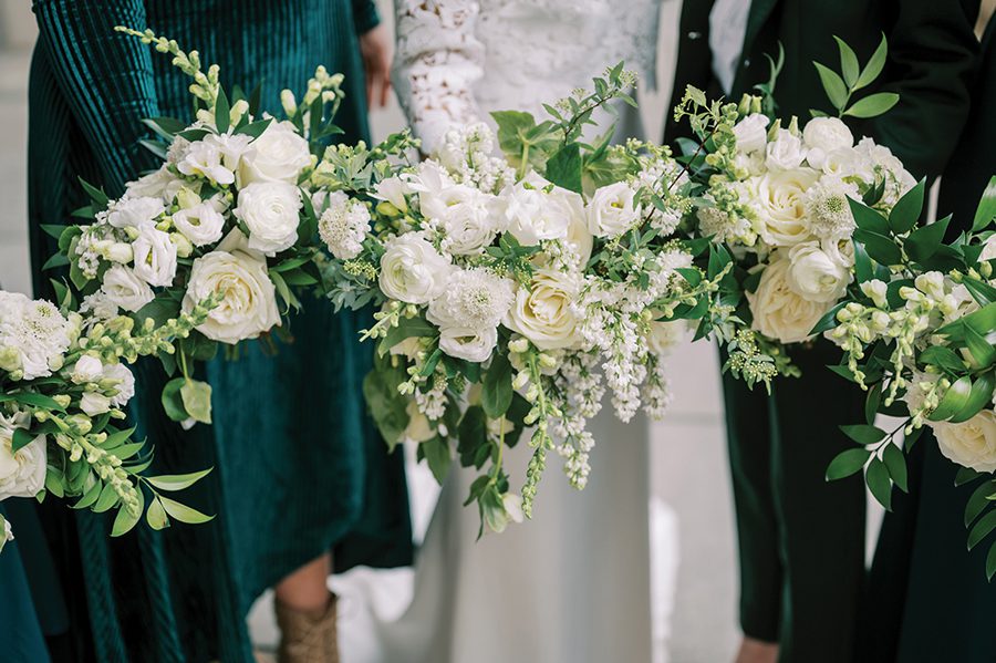 For the reception, the couple wanted a classic, elegant and cozy vibe that would stand the test of time. “We wanted to look back on pictures of our day in 50 years and still absolutely love the way everything looked,” Jamie says. With skyline views of Charlotte in the background, Sarah Cook of SoHo Event Design created a chic, modern feel, tapping into Jamie’s love for green and desire for plenty of candlelight. Pairing lush white and green florals with deep green and black accents, she mixed in texture and layered elements in neutral colors.